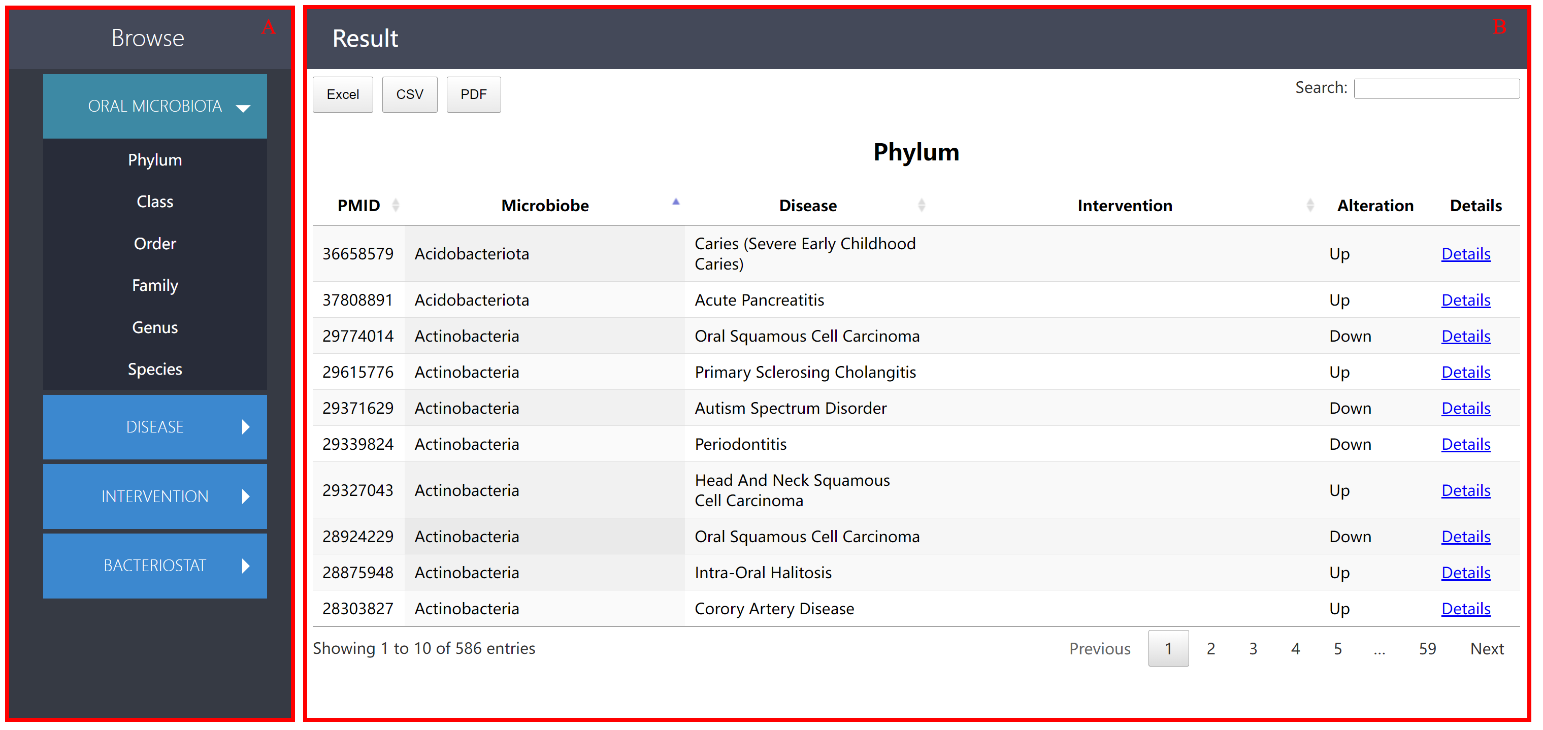 There is a navigation bar on the left on "Browse" page(Figure 1A): "Microbiota" are classified according to taxonomy; "Diseases" are divided into three categories: oral-related diseases, systemic diseases and other diseases. "Intervention" is divided into six categories: treatment effect, drug effect, food & drinking (dietary differences), smoking effect, age differences and others. "Bacteriostat" is classified according to the type of active ingredients: extracts, compounds and other ingredients. Every result in the overview contains the following data: related publication ID(PMID), microbe/taxonomy name, related disease, intervention, quantity variance (reduced or elevated), detailed information of each items can be acquired by clicking the "Details" button at the end of the entry.(Figure 1B)