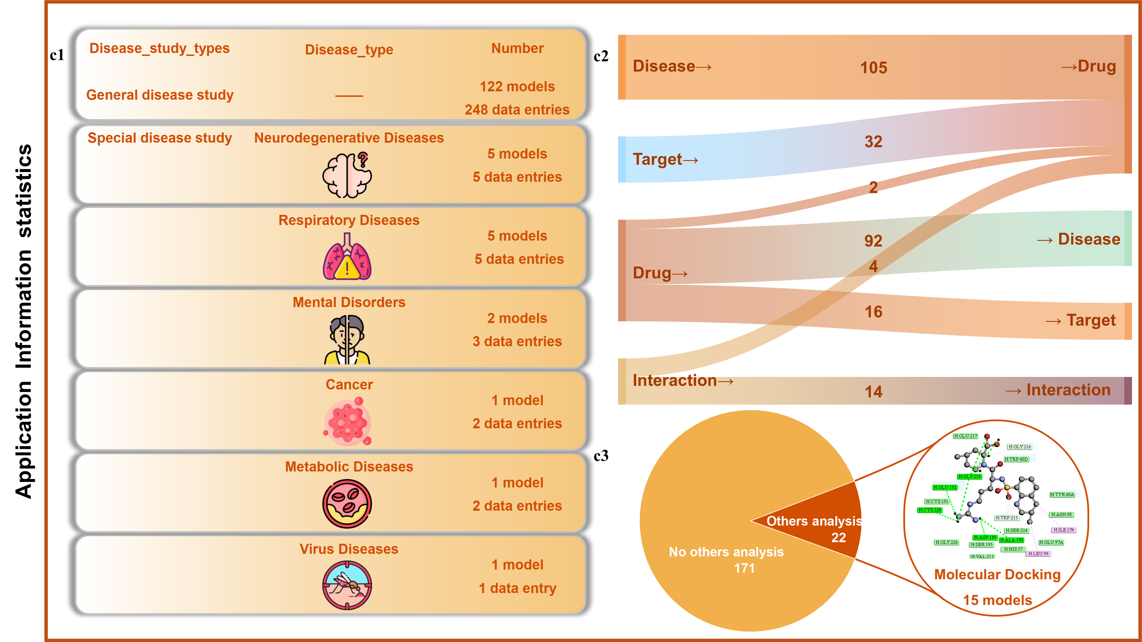 DRPMKB 1.0 is built from PubMed articles up to March 2024. It includes 2 interfaces (display and interaction), 4 dimensions (data, model, application, and reference), 45 categories, 193 models, and 693 entries, offering a comprehensive platform for DR models. The core goal of DR is to find new drug indications. For Alzheimer's disease, DRPMKB 1.0 retrieved 17 models and 84 entries for 126 predicted drugs, 42% of which are neurological, supporting interdisciplinary research and efficient drug identification.