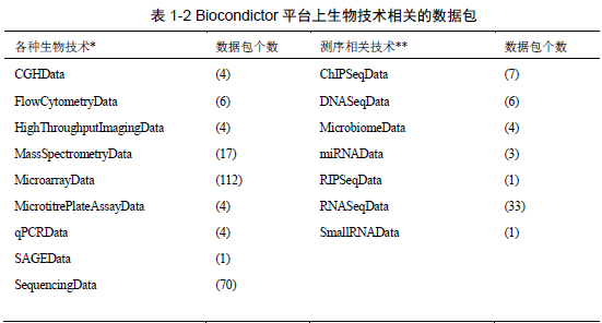 Biocondictor平台上有关生物技术相关的数据包有202个,其中测序相关的软件包有70个,见表1-2(详细信息见相关网页)。