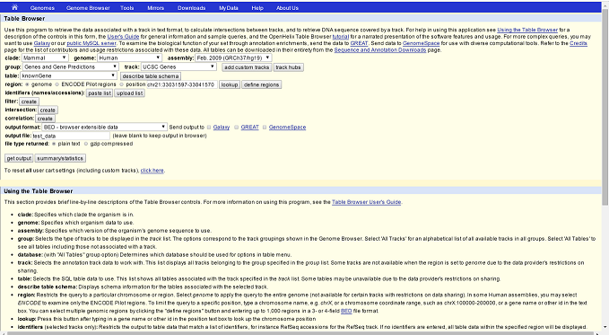 首先登录UCSC的网站:http://genome.ucsc.edu/,点击Table Browser,如图设置参数(以bed数据格式为例),点击get output按钮;