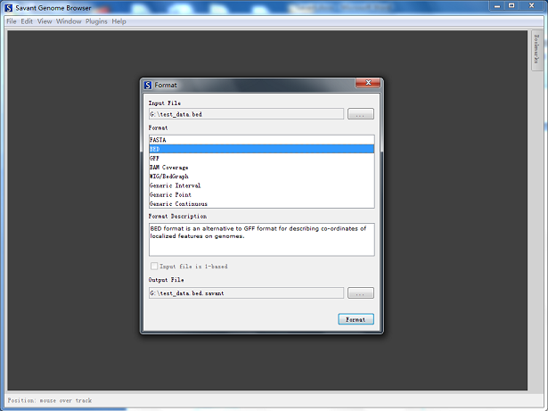 Savant支持一些文件格式。这些文件被指定格式转换在用于确定数据检索速度之前。为了去学习如何直接的输出Savant格式文件。打开软件Savant,初始界面:点击File->Format File,得到Format对话框,选择需要导入的文件格式,BED格式和输出文件,点击Format按钮进行文件的格式转换: