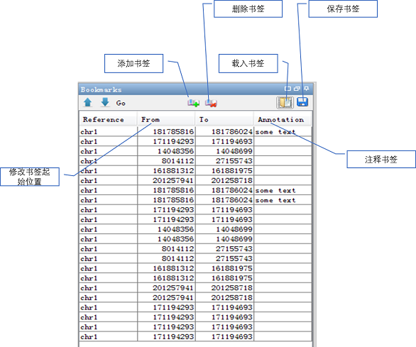 一个书签能够通过点击嵌入在书签模块的按钮进行添加。当前的范围将会被用作书签,书签的起始和结束坐标可以通过双击和改变它们进行调节。还可以进行书签的添加、注释、保存、载入等操作,如图11-8所示。