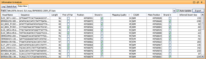 表视图模块以表格形式展现在当前范围的数据。这个模块以列显示记录,以行显示字段在一个数据电子表中。数据自动的更新当一个范围改变,除非更新检查框不检查了。表视图模块,显示从一个短序列片段比对的轨迹得到的数据。