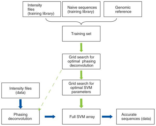 图3-1显示了Alta-Cyclic的处理流程。Alta-Cyclic能够很好地将碱基识别长度延长至78个bp,并且相对较好地减少系统的偏差。由于统计的模型是使用了SVM,所以在运行Alta-Cyclic处理待处理的数据之前要进行一下数据集的训练过程,使得了Alta-Cyclic这款软件相对比较依赖训练集数据。Alta-Cyclic采用了三个来源的数据作为训练集,然后用贪婪算法寻找最优化的相重叠问题。此时加上强度质量文件,最优化SVM参数,从而得到SVM数据以及准确的序列文件。Alta-Cyclic的下载地址为:http://hannonlab.cshl.edu/Alta-Cyclic/main.html。