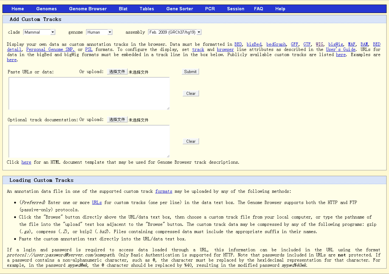 UCSC的genome browser是比较常用的对序列进行可视化的工具,网址:http://genome.ucsc.edu/。进入主页后点击窗口左边竖列的第一项“Genome Browser”,就会进入Genome Browser Gateway。选择合适的物种基因组后点击页面中央的“add custom tracks”按钮即可进入数据上传页面,用户可以直接贴上数据或者数据的链接地址,也可以点击“选择文件”按钮以导入你之前的ChIP-seq的数据,选好后点击“submit”按钮即可提交。等待一段时间,在数据上传成功后的页面上点击右侧的“go to genome browser”按钮即进入结果页面。