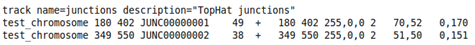 转换后可以用文本剪辑工具打开文件。命令行输入”more accepted_hits.sam”或”gedit accepted_hits.sam”。这里,每一条记录为一条序列片段与参考基因组的比对结果,如图7-1所示。具体参考格式说明可以参考网页说明http://genome.ucsc.edu/FAQ/FAQformat.html,另一个文件”junctions.bed”为用bed格式存储的预测到的可变剪接位点信息,如图7-2所示。