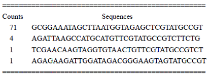 1)smrna.fa:miRNA文库文件。将非FASTA格式的miRNA文库文件转换成FASTA格式,并且给每个序列增加一个标号(ID),条目如下: