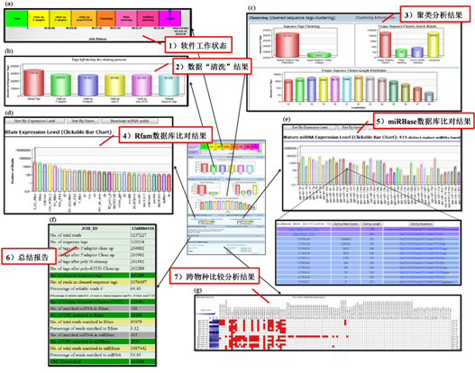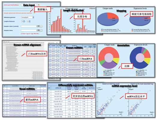 软件的运行结果主要包括:1)输入数据的总结报告;2)输入数据中包含已知miRNA的统计结果;3)与其它转录组序列比对的统计结果;4)预测到的新miRNA的统计结果;5)未匹配的读段信息等。